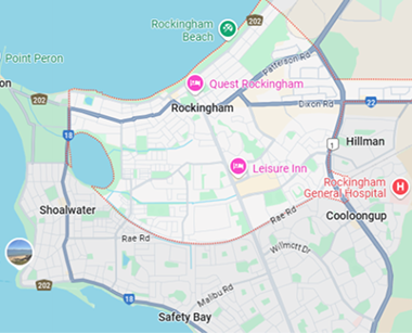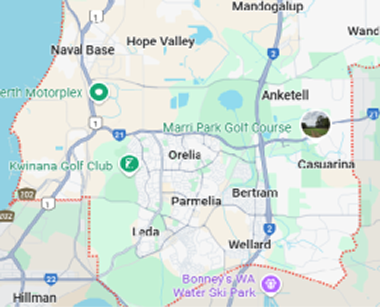 Anketell 6167, Baldivis 6171, Beeliar 6164, Bertram 6167, Bibra Lake 6163, Byford, WA 6122, Calista 6167, Casuarina 6167, Cockburn Central 6164, Coogee, WA 6166, Cooloongup 6168, East Rockingham 6168, Hamilton Hill, WA 6163, Hammond Park, WA 6164 , Hilbert, WA 6112, Henderson 6166, Hillman 6168, Hope Valley 6165, Kwinana Beach 6167, Kwinana Town Centre 6167, Leda 6170, Mandogalup 6167, Medina 6167, Munster 6166, Naval Base 6165, North Coogee, WA 6163, Oakford 6121, Orelia 6167, Parmelia 6167, Port Kennedy 6172, Postans 6167, Rockingham 6168, Safety Bay 6169, Shoalwater 6169, Shoalwater, WA 6169, South Lake, WA 6164, Spearwood 6163, Success 6164, The Spectacles 6167, Waikiki 6169, Wandi 6167, Warnbro 6169, Wattleup 6166, Wellard 6170, Yangebup 6164